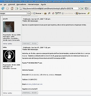 Con frecuencia se publica en Noticiero Digital direcciones, lugares de empleo y otros datos de personas vinculadas con sectores progresistas, como ocurrió con los estudiantes bolivarianos que acudieron a la Asamblea Nacional en junio de 2007 a exponer su punto de vista frente a estudiantes opositores. En aquella oportunidad, las direcciones de habitación de Andreína Tarazone y Héctor Rodríguez fueron publicadas en Noticiero Digital, con amenazas contra ellos. Las amenazas la obligaron a mudarse de residencia.