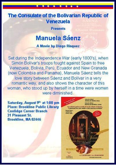 Boston, 7 de agosto de 2008.- Continuando con su programación cultural, el Consulado General de la República Bolivariana de Venezuela en Boston tiene el placer de extender una invitación al público en general a la proyección de la cinta venezolana "Manuela Sáenz" del director Diego Risquez.