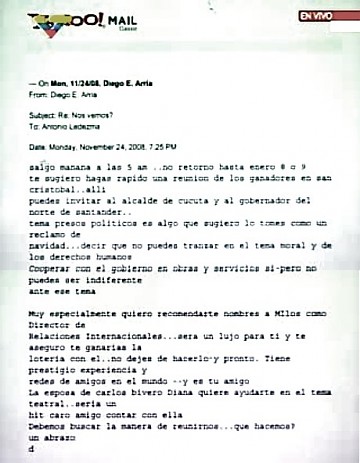 Nolia luego presentÓ un supuesto email entre Diego Arria y Antonio Ledezma, donde le sugiere organizar una reunión en San Cristóbal entre varios candidatos de la oposición que habían resultado ganadores para reunirlos con el gobenrador del Norte de Santander y con el alcalde de Cúcuta, quienes según Nolia son "dos de los jefes más importantes del grupo narcoparamilitar Las Águilas Negras". Según Nolia, Ledezma acudió a Colombia para buscar asesoría en materia de seguridad.