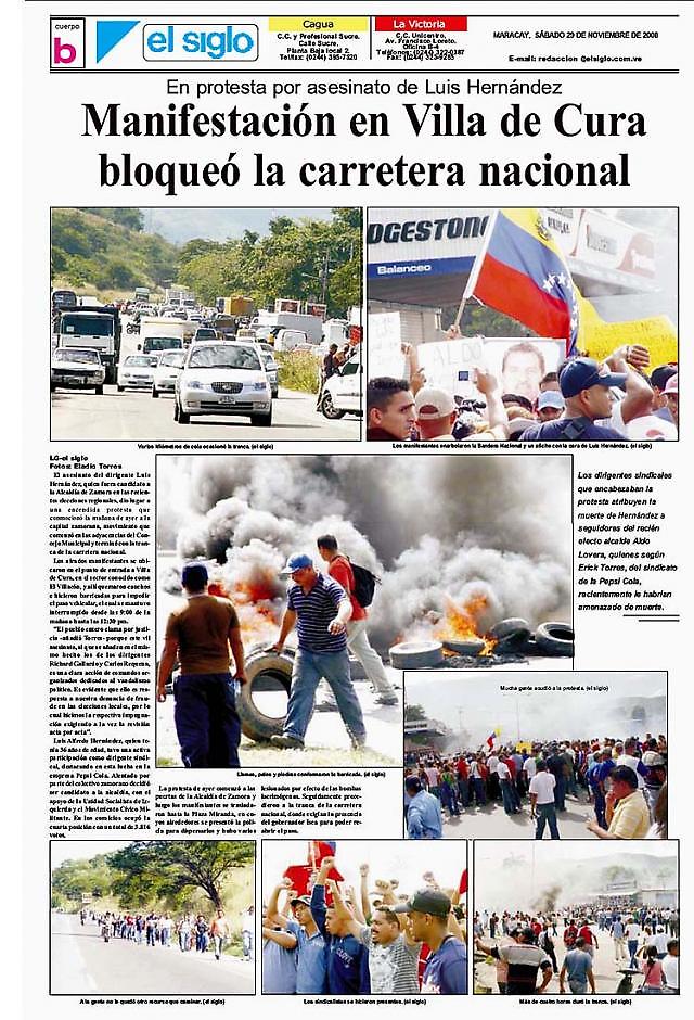 Centenares de seguidores de los dirigentes asesinados, así como una gran cantidad de trabajadores, los cuales confiaban en sus camaradas de luchas, hoy abatidos por la acción cobarde del sicariato, comenzaron protestas en la mañana de este viernes en todas las vías importantes entre las ciudades de Maracay y Valencia, prologándose esta situación hasta Villa de Cura, en donde las acciones terminaron con el cierre de los comercios de la localidad. Se puedo conocer al cierre de la presente nota, que la localidad de Villa de Cura, ha sido la más afectada por las protestas.