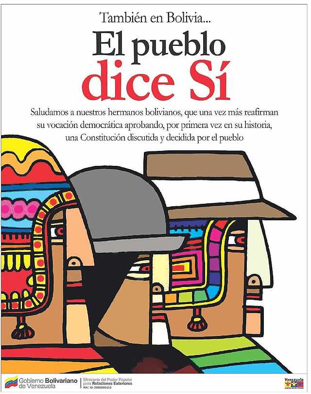 “El sí ganó en Bolivia con un 63%. El sí cabalga por América Latina. Saludamos ese triunfo. Creo que en América Latina se está imponiendo una nueva doctrina constitucional que comenzó por Venezuela, hace 10 años, es la convocatoria del poder constituyente originario. Uno se pone a revisar hacia atrás la historia del continente y no hay antecedentes en el siglo 20', manifestó.