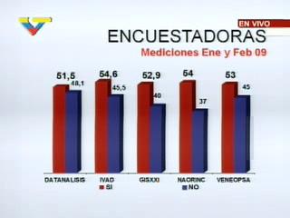 07 de febrero 2009. - A 8 días de la celebración del Referendo Aprobatorio de la Enmienda Constitucional, el domingo 15F, los últimos sondeos de empresas encuestadoras serias revelan que la tendencia creciente de la opción del SÍ supera ampliamente a la del "no", por lo cual los medios privados opositores ocultan al pueblo estas cifras y se empeñan en reforzar el sesgo informativo con mentiras y tergiversaciones.