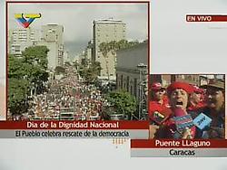 13 de abril 2009.- Con las típicas franelas de color rojo ataviando a cientos de caraqueños y personas provenientes de diversos estados del país, toda la avenida Urdaneta de Caracas se desborda con mucha alegría, para conmemorar junto al presidente Hugo Chávez, el Día del Rescate de la Dignidad Nacional, hoy 13 de abril, a 7 años del golpe de Estado de 2002.