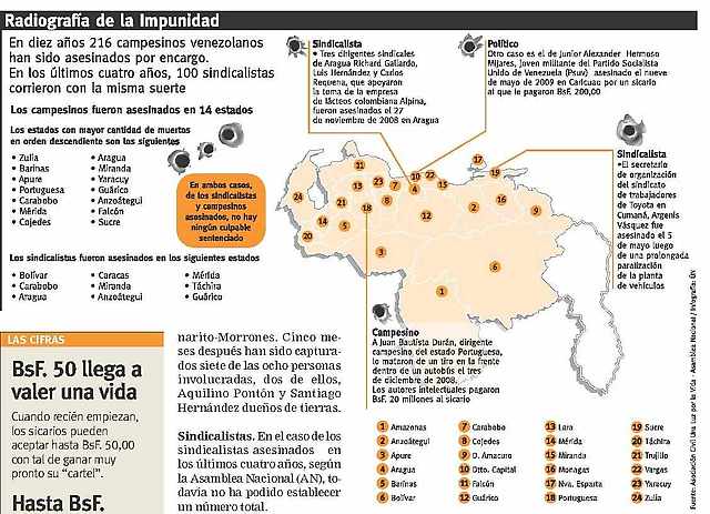 Muerte campesina. Desde 2001, cuando entró en aplicación la Ley de Tierras, hasta finales de abril de 2009, según el diputado Braulio Álvarez, han sido asesinados 216 campesinos en 14 estados.