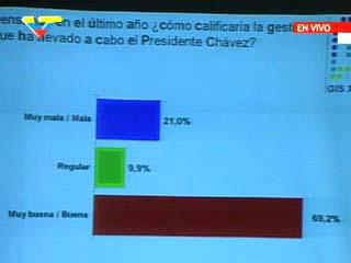 "Ante la pregunta: Pensando en el ultimo años, ¿como calificaría la gestión que ha llevado a cabo el Presidente Chávez?, 69,2% de los encuestados respondió muy buena/buena, 9,9% la evaluó como regular 9,9% y 21,0% de muy mala/mala", informó Vielma Mora.