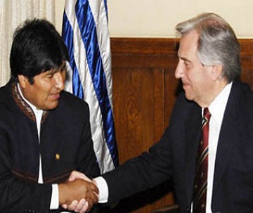 14 de julio 2009. - Los presidentes de Uruguay, Tabaré Vázquez, y de Bolivia, Evo Morales, firmaron el lunes un principio de acuerdo para que el país andino acceda al mar Atlántico por puertos uruguayos en condición de libre tránsito y almacenaje liberado.