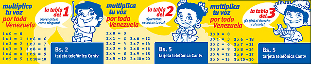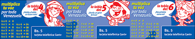 Multiplica tu voz por toda Venezuela es el lema de la nueva colección de tarjetas Cantv para teléfonos públicos, cada una con una tabla distinta, que también incluyen un personaje ilustrado que simboliza a cada región del país. El andinito, el llanerito, el oriental, el maracuchito y la indígena, entre otros, comunicarán frases positivas y consejos para estimular el aprendizaje de las tablas de multiplicar. Las tarjetas coleccionables únicamente funcionan en los Teléfonos Públicos y se consiguen en dos denominaciones: Bs. 2 y Bs. 5.