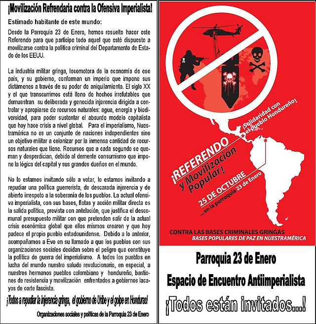 El sábado en la Reunión Asamblearia continúa la organización de la Jornada Refrendaria, ubicación de urnas por sectores, detalles sobre el Acto Político Cultural de cierre, elaboración de pancartas, perifoneo, pega de afiches y reparto de propaganda. Como siempre, la unidad y amplitud de esta Jornada está abierta a los colectivos de las parroquias de Caracas que quieran asumir este compromiso antiimperialista.