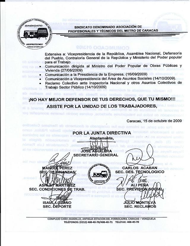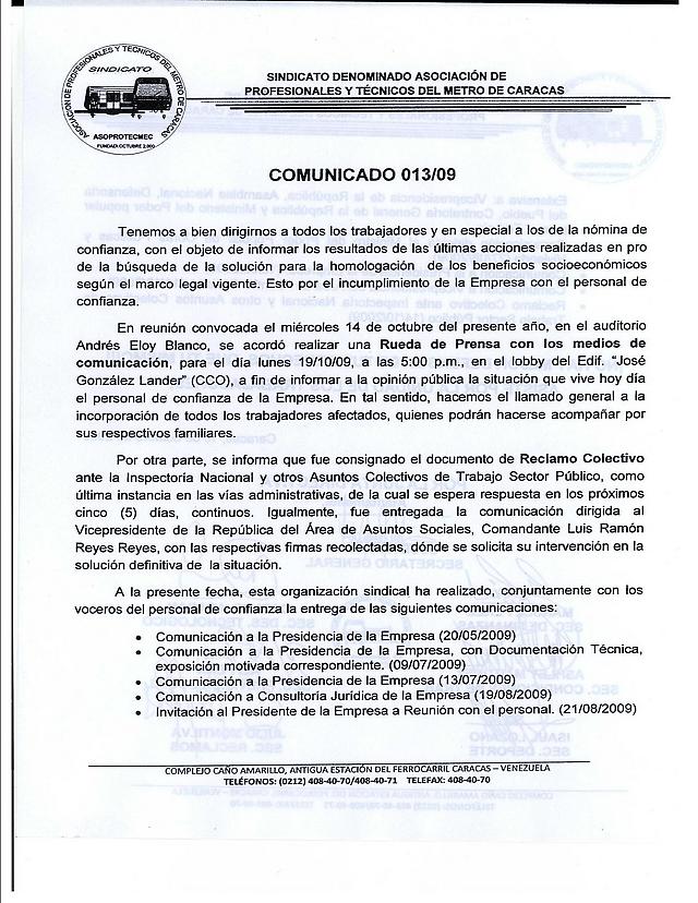 Voceros del Metro de Caracas informan que la Junta Directiva de la Asociación de Profesionales y Técnicos (ASOPROTEMEC) acordó una Rueda de Prensa con todos los medios de comunicación para hoy Lunes 19 del 2009, a las5:00 pm., en el lobby del Edificio "José Gonzalez Lander", ubicado en la Estación La Hoyada, con el fin de informar al Ejecutivo Nacional y a la Opinión Pública sobre la situación laboral de un sector de 1500 trabajadores a los cuales no se les ha hecho efectivo la Homologación de los Beneficios Socioeconómicos de la IX Convención Colectiva.
