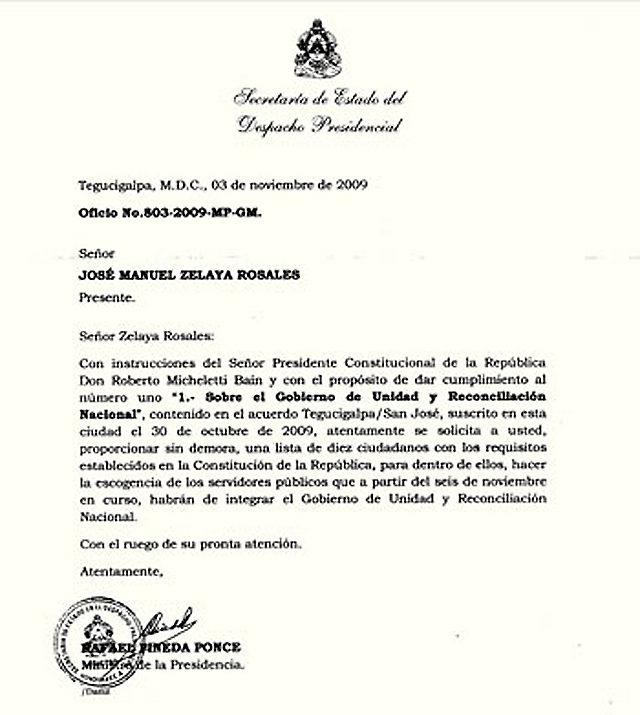 Según la misma, Micheletti pide a Zelaya enviar "sin demora, una lista de diez ciudadanos con requisitos establecidos en la Constitución de la República, para dentro de ellos hacer la elección de los servidores públicos que, a partir del 6 de noviembre, habrán de integrar el gobierno de unidad y reconciliación nacional", pide Micheletti.