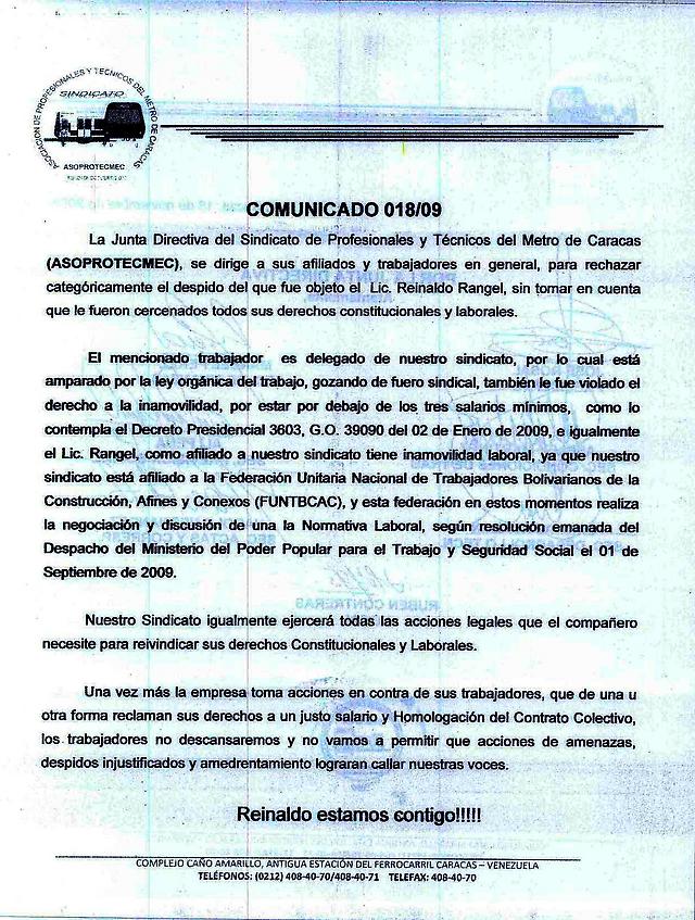 Metro excluido ilegalmente de la Convención Colectiva" (http://www.aporrea.org/actualidad/n145601.html), debido a la respuesta que la Vicepresidencia de la República Bolivariana de Venezuela, a través de su Dirección General, le da al propio Reinaldo Rangel y donde se le anexa una comunicación de respuesta a la Vicepresidencia, suscrita por el el Presidente del Metro, en la cual Victor Matute reconoce la deuda contractual a los trabajadores, coloca en duda el caracter de "confianza" con que son catalogados los mismos, especifica que estos trabajadores tienen 5 años sin recibir incremento salarial y precisa que Reinaldo Rangel, el trabajador despedido, es "Vocero del Personal Adscrito a la C.A. METRO DE CARACAS comprendido dentro de la clasificación genérica "DE CONFIANZA""