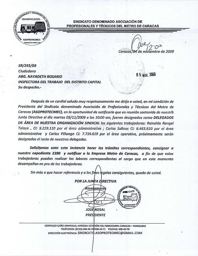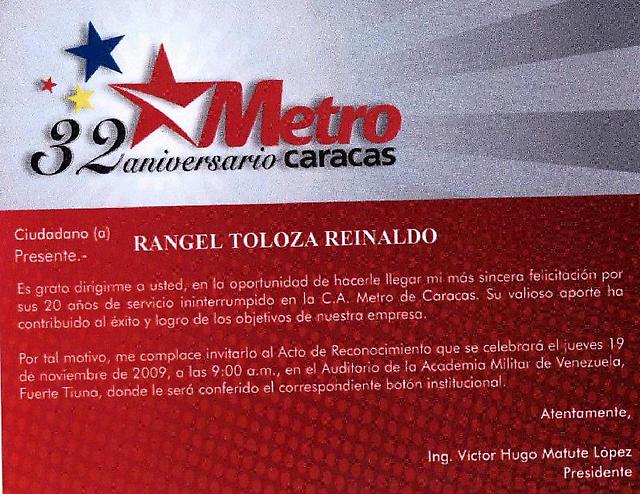 Ayer 18 de noviembre fue despedido ilegalmente el trabajador Reinaldo Rangel (se anexa comunicación donde se notifica a la Inspectoria del Trabajo del Distrito Capital su condición de Delegado Sindical y la comunicación del presidente del Metro, Victor Matute, donde se le notifica el despido). Sorpresiva o ironicamente, cuando un dia antes del despido se le hace entrega de una invitación para conferirle un boton institucional por sus 20 años de servicio en esta empresa del estado venezolano(ver anexo). En esta misma pagina de aporrea se publicó hace tres días la noticia titulada