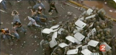 El video que difundió France 2, muestra a un grupo de manifestantes enfrentándose a un pelotón policial que evidentemente tiene rasgos y características muy distintas a los cuerpos de seguridad iraníes.