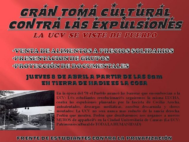 06 de abril de 2010.- Se les invita a la toma cultural de la Universidad Central de Venezuela en contra de las expulsiones este jueves 8 de abril a partir de las 8 de la mañana y durante todo el día en "Tierra de Nadie"