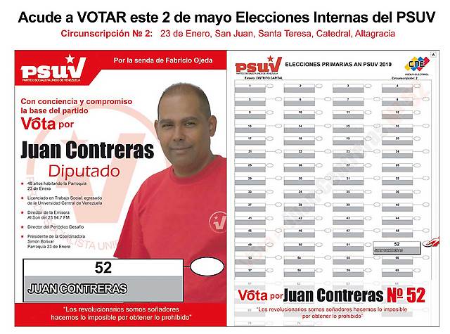 Entrevista concedida el 28 de Abril del año en curso, al equipo redactor del Periódico “El Desafío”, por Juan Contreras, precandidato del PSUV a la AN, ubicado en el número 52 del tarjetón correspondiente, por la Circunscripción numero 2 del Municipio Libertador y que comprende las parroquias: 23 de Enero, San Juan, Santa Teresa, Catedral y Altagracia.