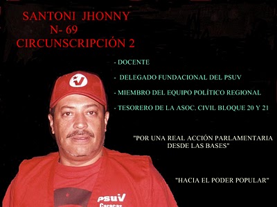 30 de mayo de 2010.- Bajo las consignas “Por una real acción parlamentaria desde las bases” y “Hacia el poder popular”, Jhonny Santoni, delegado fundacional del PSUV se postula como candidato a la Asamblea Nacional por la Circunscripción, 2 San Juan, Santa Teresa, Catedral, Altagracia y 23 de Enero.