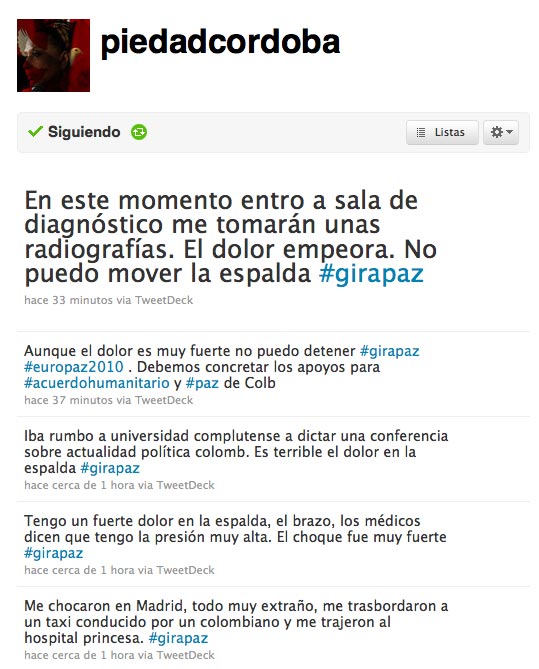 A continuación los tweets enviados por Piedad Córdoda en la mañana de hoy a raíz del accidente de tránsito: