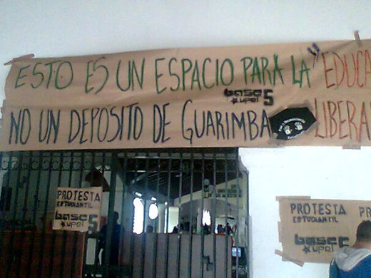 18 de mayo 2010.-La sede rectoral de la Universidad Pedagógica Experimental Libertador, ubicada en Catia, al oeste de Caracas permance tomada por un numeroso grupo de estudiantes miembros de la confederación de centros estudiantiles Bolivarianos de la UPEL y del movimiento BASE (Bloque Antiimperialista Socialista Estudiantil). Las acciones de protesta se repiten en las sedes del Pedágogico de Maturín, Barquisimeto y El Mácaro.