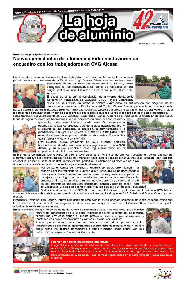 Reafirmando el compromiso con la clase trabajadora de Guayana -tal como lo expresó el pasado sábado el presidente de la República, Hugo Chávez Frías-, este martes los nuevos presidentes de las empresas del sector aluminio, hierro y acero, escogidos por los trabajadores, así como los ratificados en sus cargos realizaron una Asamblea en el portón principal de CVG Alcasa.
