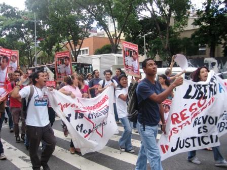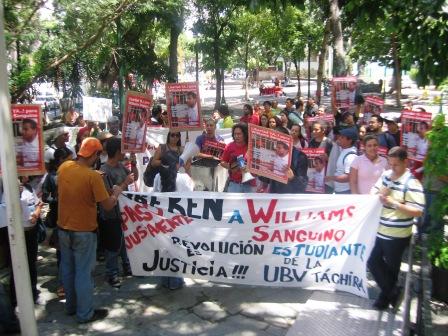 24 de junio de 2010.- Una movilización estudiantil y popular se produjo este miércoles 23 de junio en Caracas, para exigir la libertad de Williams Sanguino. Se trata del joven estudiante y militante del PSUV que fue apresado en el Táchira, y que permanece sin proceso judicial desde hace 6 meses. Su detención se llevó a cabo al ser señalado por participar en una concentración de defensa de la sede de la UBV en ese Estado, ante una fuerte arremetida de la banda derechista de los "Manitos Blancas", protagonistas de frecuentes acciones violentas, que trataba de destrozar esa Universidad. En el transcurso del intento de asalto apareció muerto de un balazo un joven del campo antichavista, en muy extrañas circunstancias. Los opositores acusaron a Sanguino, mientras que los estudiantes de la UBV atribuyen el asesinato a los propios atacantes.