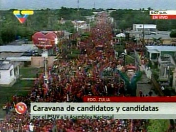 La caravana estuvo encabezada por el presidente del PSUV, Hugo Chávez Frías, quien junto a la marea roja bolivariana se dirige hacia los muelles Soberanía y Patria Grande, ubicados en el sector Las Morochas de Lagunillas.