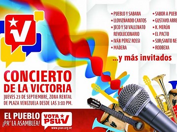 Caracas, septiembre 23 - Aristóbulo Istúriz, Jefe del Comando Nacional de Campaña Bolívar 200, anunció que el Partido Socialista Unido de Venezuela (PSUV) cerrará su campaña en Caracas el jueves 23 de septiembre con 7 caravanas que confluirán en la Zona Rental de Plaza Venezuela, donde tendrá lugar el "Concierto de la Victoria".