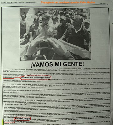 Es realmente vergonzoso, contrario a todas las normas de contiendas electorales y a los derechos ciudadanos consagrados en la Constitución Nacional, el libelo publicado el último día de campaña con la firma del candidato opositor Pablo Medina en el diario Últimas Noticias (23-09-2010, p.43). Ni siquiera su copartidario del ultraderechista Movimiento 2D, Miguel Henrique Otero, se atrevió a insertarlo como publicidad en el diario El Nacional.