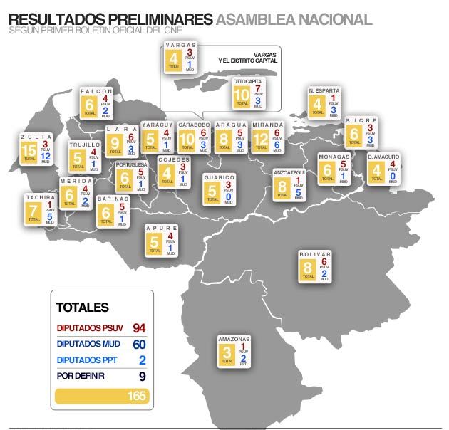 PSUV trunfó en: Aragua, Barinas, Bolívar, Carabobo, Cojedes, Delta Amacuro, Distrito Capital, Falcón, Guárico, Mérida, Monagas, Lara, Portuguesa, Trujillo, Yaracuy y Vargas; igualó en Miranda y Sucre.