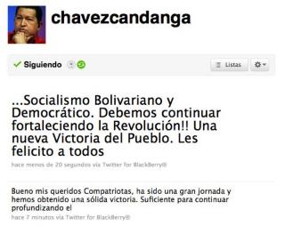 "Bueno mis queridos Compatriotas, ha sido una gran jornada y hemos obtenido una sólida victoria. Suficiente para continuar profundizando el Socialismo Bolivariano y Democrático. Debemos continuar fortaleciendo la Revolución!! Una nueva Victoria del Pueblo. Les felicito a todos"