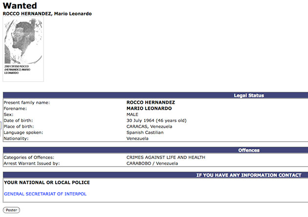 Sobre el ex policía, quien se declaró “perseguido político de Chávez”, pesa una orden internacional de captura emitida por Interpol Venezuela por su implicación en los hechos ocurridos en la llamada “Masacre de Canaima”, en la que murieron cuatro estudiantes de la Universidad de Carabobo detenidos durante la insurrección cívico-militar para derrocar al entonces presidente Carlos Andrés Pérez.