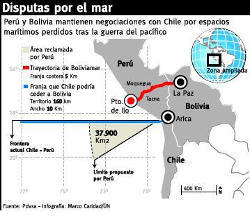 Entre Chile y Perú. En este punto, cabría recordar la disputa entre Perú y Chile por los límites marítimos entre ambos países, la cual está en estos momentos en la Corte Penal Internacional de La Haya.