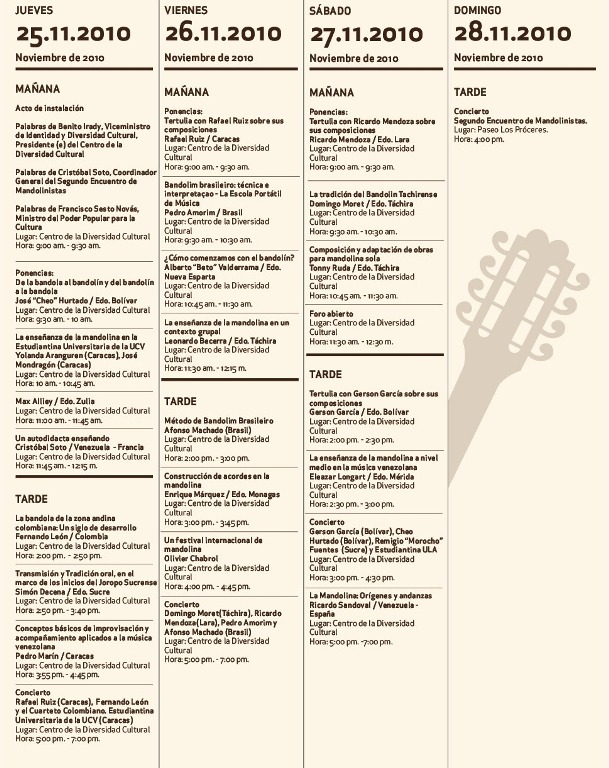 La historia, desarrollo y posibilidades de la mandolina en los Andes, en la región central, en Lara y en oriente (Monagas, Sucre, Nueva Esparta están representados) abre igualmente un buen compás de enseñanza para quienes quieren nutrir sus conocimientos en torno a la venezolanidad.