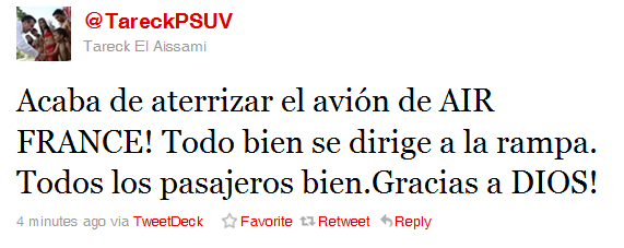 Caracas, abril 14 - El ministro de Interior y Justicia Tareck El Aissami informó anoche a través de su cuenta de Twitter que el avión de AirFrance que presentó problemas tras su despegue aterrizó en el aeropuerto de Maiquetía sin mayores inconvenientes. “Acaba de aterrizar el avión de AIR FRANCE! Todo bien se dirige a la rampa. Todos los pasajeros bien.Gracias a DIOS!”.