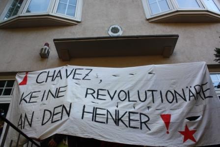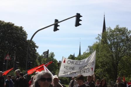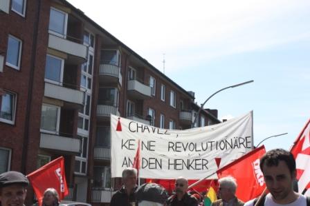 genocida de Colombia. Un número bastante visible de manifestantes que participaban en la marcha del 1º de Mayo en la ciudad alemana de Hamburgo, se dirigieron hasta la sede del Consulado Venezolano en esa ciudad y expresaron su rechazo a la deportación, con consignas y con pancartas que colocaron en la fachada. Se trata de gente que en otras oportunidades se ha movilizado y que ha realizado actividades en apoyo a la revolución bolivariana; pero en esta ocasión mostraron su disgusto por una política que "nos da la espalda" y que dicen no poder comprender ni aceptar como procedente de un "gobierno revolucionario esperanzador para los pueblos latinoamericanos". Ellos mismos reportan su noticia y aportan las gráficas de la movilización: