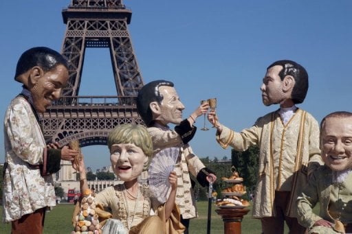 Los hombres vestidos con jubón de seda sobre pechera de encaje y la única mujer (Angela Merkel) con vestido largo, collar de perlas de tres vueltas y abanico: ocho cabezudos con las caras de los ocho dirigentes del G8 se instalaron en el Campo de Marte, al pie de la Torre Eiffel.