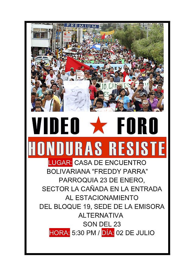 30 de mayo de 2011.- Este jueves 2 de junio a las 5:30 p.m. en la Casa de Encuentro Freddy Parra, sede de Tu Emisora Libre Al Son del 23 en la populosa y combativa parroquia 23 de Enero a una cuadra de la estación del metro de Agua Salud se relizará un VIDEO-FORO con la RESITENCIA HONDUREÑA.