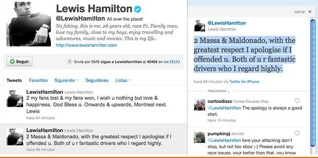 “A Massa y Maldonado con el más grande respeto, me disculpo si los ofendí. Ambos son fantásticos pilotos. Los respeto mucho”, escribió en su cuenta en Twitter.