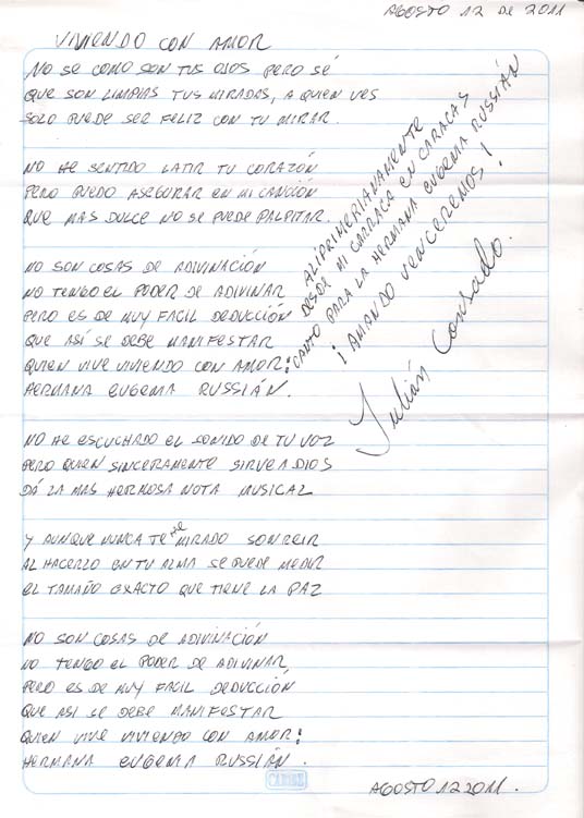 Esta vez nos hizo llegar su última creación, su más próxima poesía cargada de verdad y pasión sincera: “Viviendo con amor”.