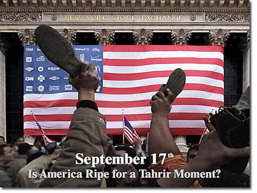 El colectivo de activistas culturales Adbusters fue el que lanzó la llamada el 13 de julio . Su mensaje, de tipo publicitario, era “Estás preparado para un momento Tahrir?”. El mismo mensaje invitaba a 20.000 personas a “inundar” el sur de Manhattan para “montar tiendas, cocinas, barricadas pacíficas y ocupar Wall Street”.