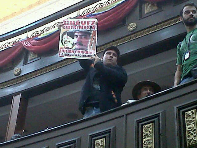 10 de noviembre de 2011.-En el marco de la realización de la presentación de 3 libros sobre el movimiento guerrillero venezolano, editados por el Fondo Editorial del IPASME, se presento un grupo de cantores con pancartas y consignas a favor de la inmediata liberación del cantor bolivariano Julián Conrado.