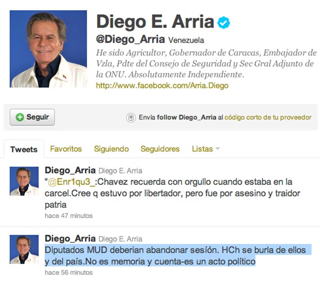 Caracas, enenro 14 - Diego Arria, uno de los pre candidatos de la MUD manifestó este viernes desde su cuenta en twitter, que los Parlamentarios de la oposición deberían retirarse de la Asamblea Nacional, ante la presentación de Memoria y Cuenta del Presidente de la República.
