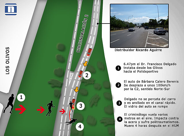 Merlin Rodríguez, director de Funsaz, informó que al sociólogo Francisco Delgado le llegó un auto, descrito como pequeño y dorado, en el canal rápido de la prolongación de la Circunvalación 2, entre los distribuidores Ricardo Aguirre y Humberto Fernández Morán, en sentido Norte-Sur, según reveló un segundo ciudadana que llamó a ese servicio de emergencia. “Una mujer acaba de arrollar a un señor y esta tendido en la carretera. Manden una ambulancia que ustedes están cerca”, dice parte de la comunicación hecha al 171.
