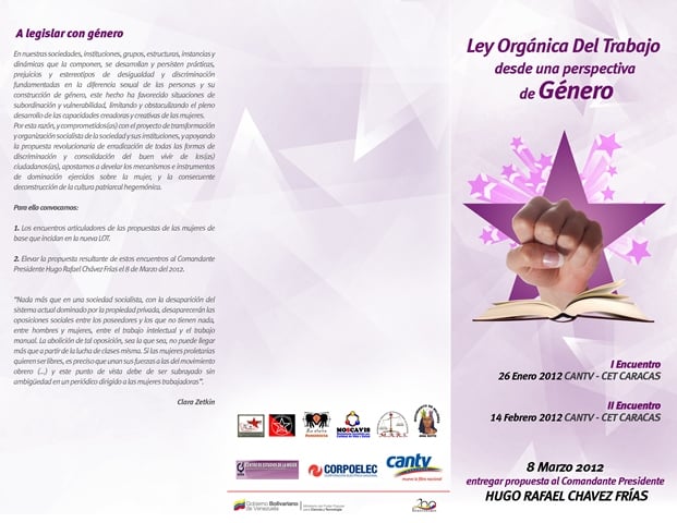 25 de enero de 2012.- En el marco de la promulgación de la nueva Ley Orgánica del Trabajo (LOT), Legislar con perspectiva de género tiene que ver justamente con develar el patriarcado como sustrato ideológico hegemónico en la discriminación de Género y en construir mecanismos para superar tales relaciones laborales inequitativas y de subordinación entre un género y otro.