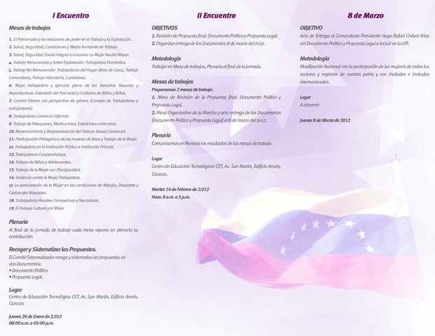 Por lo que diferentes Movimientos Sociales/Organizaciones de Mujeres que vienen trabajando para contribuir a una Ley Orgánica que defienda el derecho al trabajo digno de las Mujeres, convocan a una primera reunión que se llevará a acabo el Jueves 26 de Enero de 2012, en el Centro de Estudios de Telecomunicaciones, CET de San Martín, Av. San Martín con calle Bolívar, Edificio Arvelo, Urb. Artigas, detrás de Centro comercial Los Molinos. Desde las 8 a.m. hasta las 5 p.m.