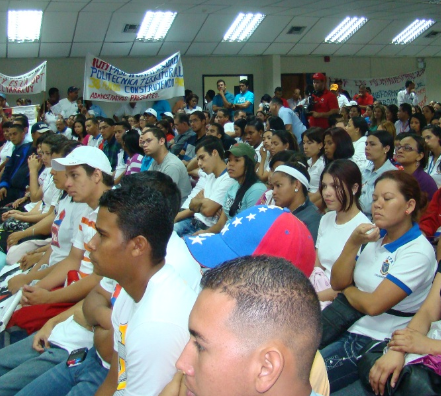 El salón “Nicolás Peraza” del Centro de Prensa “Henrique Tirado Reyes”, de San Felipe, estuvo repleto de representantes de las universidades de Yaracuy (Uney), de la Fuerza Armada (Unefa), “Simón Rodríguez” (Unesr), Bolivariana de Venezuela (UBV) y “Francisco de Miranda” (Unefm), y del Instituto Universitario del estado Yaracuy (Iuty) y la Misión Sucre, además de estudiantes yaracuyanos de la Universidad de Carabobo y de varios países hermanos en el estado gracias a la Alianza Bolivariana para los Pueblos de Nuestra América (Alba). Aupados por el presidente de Inajudey, Epifanio Ochoa, todos corearon consignas, rieron y aplaudieron las diversas manifestaciones de respaldo a las políticas del Comandante Presidente, Hugo Chávez, cuya victoria en la entidad en los próximos comicios presidenciales del 7 de octubre aseguran de manera contundente.