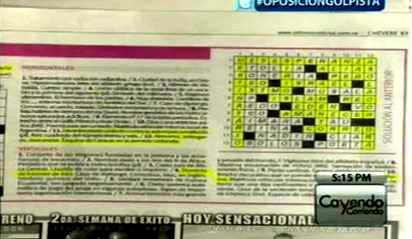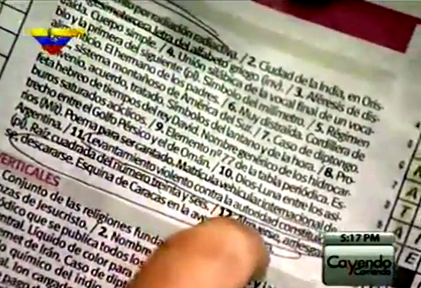 11 mayo 2012 - Miguel Ángel Pérez Pirela, moderador del programa de TV "Cayendo y Corriendo" realizó una nueva denuncia en cuanto a mensajes encriptados en el crucigrama perteneciente al diario de la familia Capriles "Últimas Noticias".