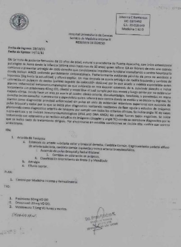 La Compatriota tiene una condición en el Corazon que los médicos la llaman- Artiritis de Tacayasu