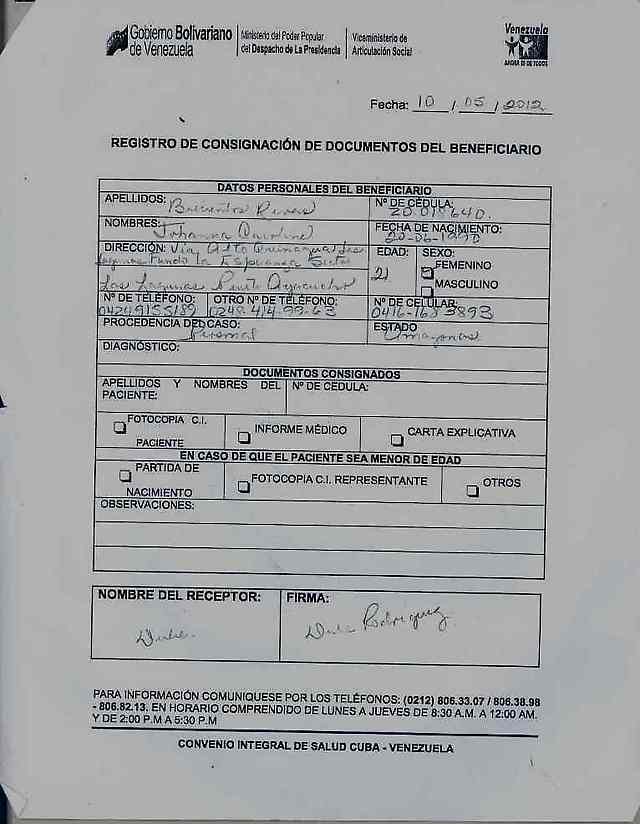 2 de junio de 2012.- Una joven en delicado estado de salud requiere con suma urgencia le sea expedido su Pasaporte a fin de poder culminar los trámites para un urgente y necesario traslado a Cuba a fin de tratar problemas de salud.