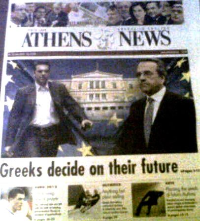 En su edición del sábado 16 de junio el periódico griego en idioma ingles anuncia que ~Grecia define su futuro~. En la portada del mismo se ve una foto con Alexis Tsipras avanzando seguro, a paso firme y un Antoni Samaras esperando desconsolado la hora que marca su futuro.