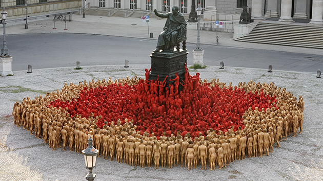 25/06/12.-Un total de 1.700 alemanes, cubiertos únicamente con pintura corporal de color oro o rojo, participaron en una sesión de fotos del fotógrafo estadounidense Spencer Tunick con motivo de la inauguración del Festival de Ópera de Múnich.